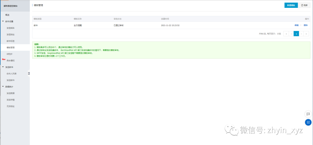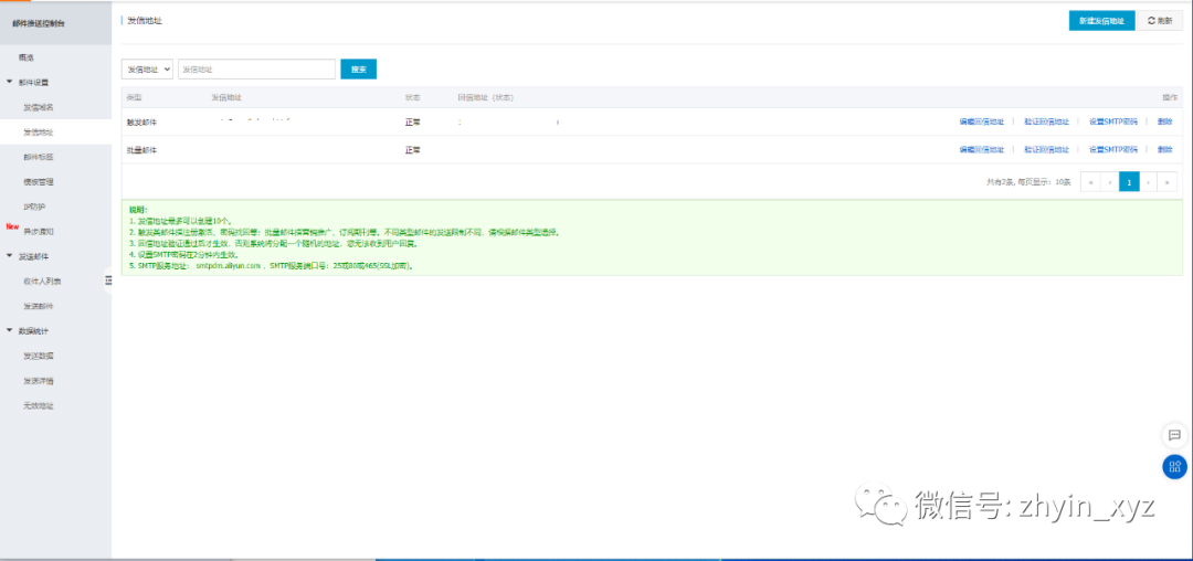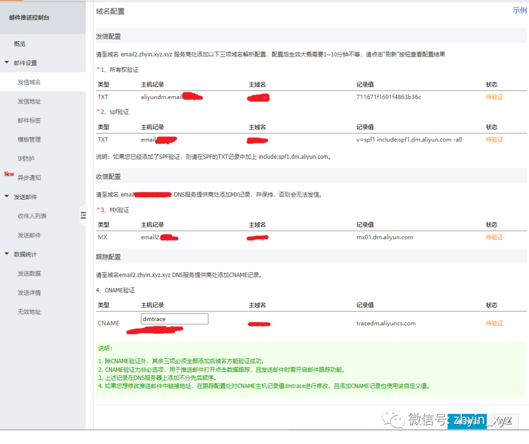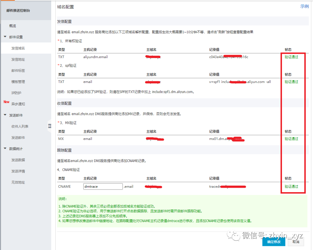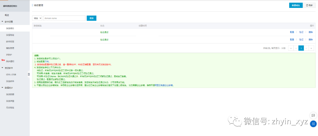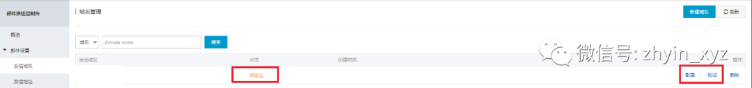 (6)回到发信域名的配置页点击验证(大约10分钟后解析生效),等待验证通过后即可通过发信域名进行发信