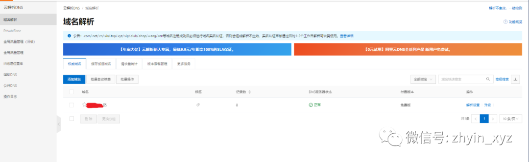 (4)前往云解析DNS控制台,点击域名(下图中红色涂抹位置),进入解析设置