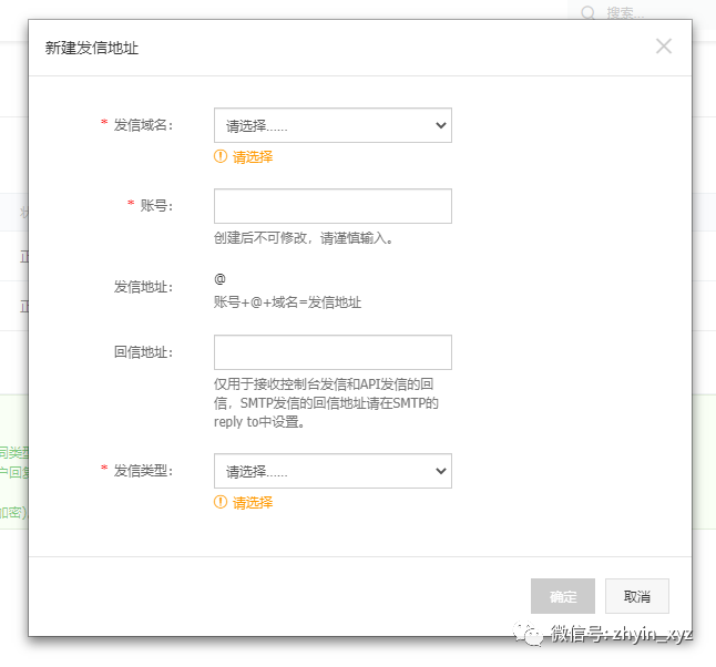 选择刚刚新建的发信域名,输入自定义的账号,设置发信类型、回信地址(一个邮箱地址)