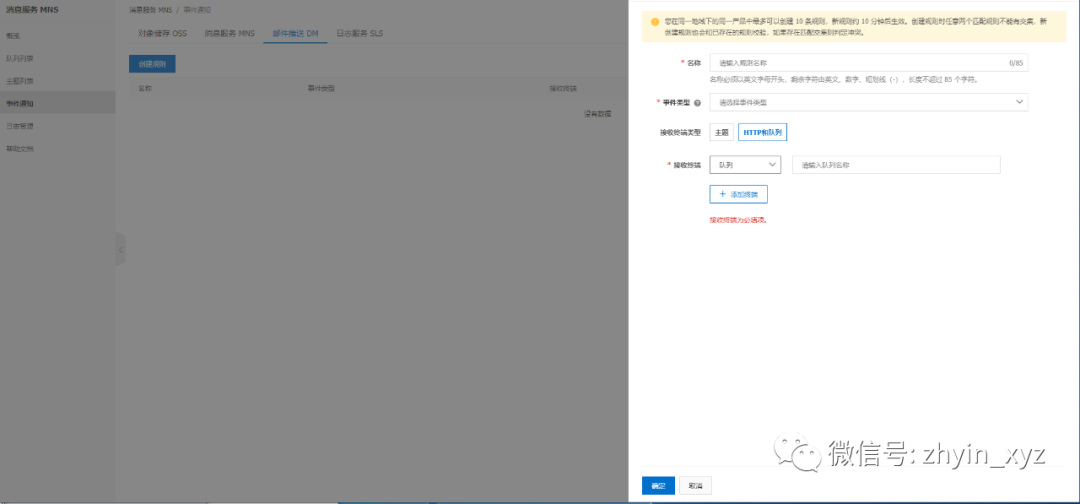 (2)创建规则,事件类型有打开、点击链接、发送成功、发送失败4种,接收终端选择队列输入队列名称点击确定