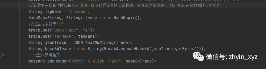 import javax.mail.*;import javax.mail.internet.InternetAddress;import javax.mail.internet.MimeMessage;import java.util.Properties;public class SampleMail {private static final String ALIDM_SMTP_HOST = "smtpdm.aliyun.com";private static final String ALIDM_SMTP_PORT = "25";//或"80"public static void main(String[] args) {// 配置发送邮件的环境属性final Properties props = new Properties();// 表示SMTP发送邮件,需要进行身份验证props.put("mail.smtp.auth", "true");props.put("mail.smtp.host", ALIDM_SMTP_HOST);props.put("mail.smtp.port", ALIDM_SMTP_PORT);// 如果使用ssl,则去掉使用25端口的配置,进行如下配置,// props.put("mail.smtp.socketFactory.class", "javax.net.ssl.SSLSocketFactory");// props.put("mail.smtp.socketFactory.port", "465");// props.put("mail.smtp.port", "465");// 发件人的账号,填写控制台配置的发信地址,比如xxx@xxx.comprops.put("mail.user", "发信地址");// 访问SMTP服务时需要提供的密码(在控制台选择发信地址进行设置)props.put("mail.password", "***");// 构建授权信息,用于进行SMTP进行身份验证Authenticator authenticator = new Authenticator() {@Overrideprotected PasswordAuthentication getPasswordAuthentication() {// 用户名、密码String userName = props.getProperty("mail.user");String password = props.getProperty("mail.password");return new PasswordAuthentication(userName, password);}};// 使用环境属性和授权信息,创建邮件会话Session mailSession = Session.getInstance(props, authenticator);// mailSession.setDebug(true);//UUID uuid = UUID.randomUUID();//final String messageIDValue = "<" + uuid.toString() + ">";// 创建邮件消息MimeMessage message = new MimeMessage(mailSession){//@Override//protected void updateMessageID() throws MessagingException {//设置自定义Message-ID值//setHeader("Message-ID", messageIDValue);//}};try {// 设置发件人邮件地址和名称。填写控制台配置的发信地址,比如xxx@xxx.com。和上面的mail.user保持一致。名称用户可以自定义填写。InternetAddress from = new InternetAddress("发信地址", "发件人名称(用户自定义填写)");message.setFrom(from);//可选。设置回信地址Address[] a = new Address[1];a[0] = new InternetAddress("***");message.setReplyTo(a);// 设置收件人邮件地址,比如yyy@yyy.comInternetAddress to = new InternetAddress("收件人邮件地址");message.setRecipient(MimeMessage.RecipientType.TO, to);//如果同时发给多人,才将上面两行替换为如下(因为部分收信系统的一些限制,尽量每次投递给一个人;同时我们限制单次允许发送的人数是60人)://InternetAddress[] adds = new InternetAddress[2];//adds[0] = new InternetAddress("xxxxx@qq.com");//adds[1] = new InternetAddress("xxxxx@qq.com");//message.setRecipients(Message.RecipientType.TO, adds);String ccUser = "抄送邮箱";// 设置多个抄送地址if(null != ccUser && !ccUser.isEmpty()){@SuppressWarnings("static-access")InternetAddress[] internetAddressCC = new InternetAddress().parse(ccUser);message.setRecipients(Message.RecipientType.CC, internetAddressCC);}String bccUser = "密送邮箱";// 设置多个密送地址if(null != bccUser && !bccUser.isEmpty()){@SuppressWarnings("static-access")InternetAddress[] internetAddressBCC = new InternetAddress().parse(bccUser);message.setRecipients(Message.RecipientType.BCC, internetAddressBCC);}// 设置邮件标题message.setSubject("测试邮件");// 设置邮件的内容体message.setContent("测试的HTML邮件", "text/html;charset=UTF-8");//若需要开启邮件跟踪服务,请使用以下代码设置跟踪链接头。前置条件和约束见文档"如何开启数据跟踪功能?"//String tagName = "Test";//HashMap<String, String> trace = new HashMap<>();//这里为字符串"1"//trace.put("OpenTrace", "1");//trace.put("TagName", tagName);//String jsonTrace = JSON.toJSONString(trace);//String base64Trace = new String(Base64.encodeBase64(jsonTrace.getBytes()));//设置跟踪链接头//message.addHeader("X-AliDM-Trace", base64Trace);// 发送附件,总的邮件大小不超过15M,创建消息部分//BodyPart messageBodyPart = new MimeBodyPart();// 消息//messageBodyPart.setText("消息Text");// 创建多重消息//Multipart multipart = new MimeMultipart();// 设置文本消息部分//multipart.addBodyPart(messageBodyPart);// 附件部分//messageBodyPart = new MimeBodyPart();//设置要发送附件的文件路径//String filename = "D:\\goProjects\\src\\测试pdf.pdf";//FileDataSource source = new FileDataSource(filename);//messageBodyPart.setDataHandler(new DataHandler(source));//处理附件名称中文(附带文件路径)乱码问题//messageBodyPart.setFileName(MimeUtility.encodeText(filename));//messageBodyPart.addHeader("Content-Transfer-Encoding", "base64");//multipart.addBodyPart(messageBodyPart);// 发送含有附件的完整消息//message.setContent(multipart);// 发送附件代码,结束// 发送邮件Transport.send(message);}catch (MessagingException e) {String err = e.getMessage();// 在这里处理message内容, 格式是固定的System.out.println(err);}}}