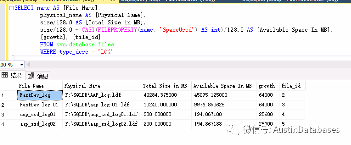 下面是一个脚本,通过这个脚本,可以看到你当前的数据库可用的ldf的数据库空间是多少