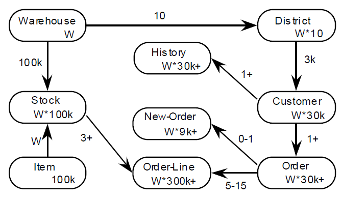 其中,表框里的数字表示该表将要存放多少条记录,仓库数W的调整在测试中能够体现数据库所能够支持的数据规模的能力;表间的数据关系数据的父子关系之间儿子的个数,比如一个Warehouse要对应10个District等,另外,“+”号表示这种对应关系可能会更多。