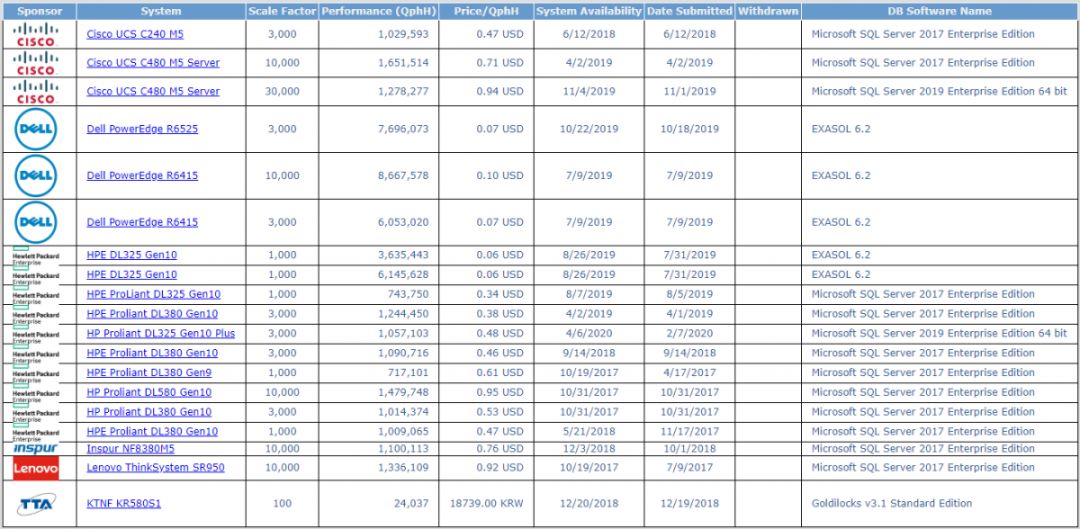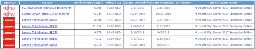 TPC-E的测试结果也主要有两个指标:性能指标(tpsE)和性价比(美元/tpsE)。