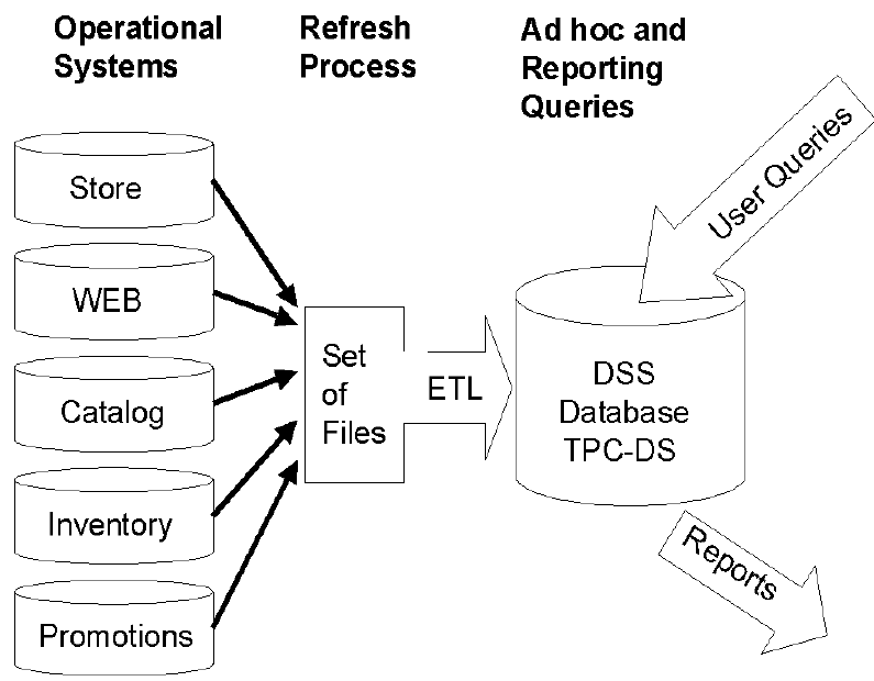 TPC-DS基准提供了两种重要的业务模型: 用户查询和数据维护。查询是把操作性的事实转化为商业情报,而数据维护操作是将数据仓库数据与操作数据库进行同步。