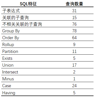 数据查询是TPC-DS基准测试的核心,包含99个SQL查询,覆盖SQL99和2003的核心部分以及OLAP。这个测试集包含对大数据集的统计、报表生成、联机查询、数据挖掘等复杂应用。在Power测试中,99个数据查询形成的查询流只执行一次,用于评测数据库对单个查询流的处理能力。在Throughput测试中,数据查询执行两次,每次执行至少20个以上的并行查询流,模拟多个用户同时对数据库的查询操作。为了适应多查询流,数据库优化组件必须依据数据规模进行规划,每个用户也要有足够的临时空间来保存大量的中间结果集。这样DBMS 能找出并行用户的最佳执行计划。下表展示了TPC-DS 基准查询所使用的SQL 特征及数量。