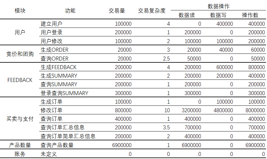 这个表格模拟了某个类电商的业务,其包含的主要模块及模块中的主要操作。针对不同的操作其交易复杂度不同(交易复杂度可理解为执行SQL语句的个数)。根据不同的读写情况,区分是数据读还是数据写。在估算了业务总量(交易量)的情况下,很容易推算出数据操作的量。通过这种方式将业务压力模型转化为数据压力模型。此处的难点在于对业务逻辑的抽象能力及对模块业务量的比例评估。