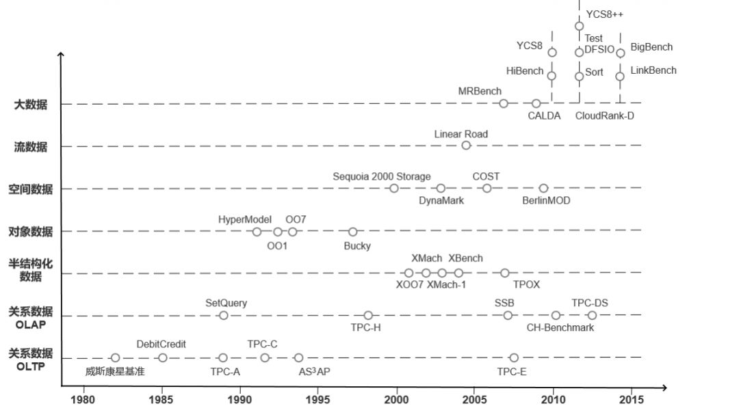 上图是来自金澈清等人所著《数据管理系统评测基准:从传统数据库到新兴大数据》一文。其描述中数据库领域基准测试的发展。从早期主要关注与OLTP到OLAP类,再到后面的对象、空间、流及大数据,其测试标准也是在不断演化之中。这里面的大多数我都没有接触过,下面将介绍下接触过的且最为常见的几类测试。