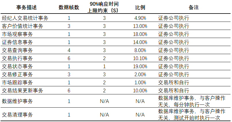 与TPC-C测量事务类型只有四种相比较,TPC-E的事务类型更加丰富,数量达到了十二种,其中包括交易查询事务、交易执行事务、交易结果更新事务等。前10种事务按照一定比例混合即成为最终测试事务合集。在这12种事务中数据维护事务、交易清理事务较为特殊,他们不是由客户端发起请求,而是数据库自身维护所要完成的工作,数据维护事务每秒钟执行一次,而交易清理事务每次测试开始时执行一次。每个事务对应数据库管理系统中的一个或多个带输入和输出参数的存储过程,单个存储过程称为一个事务帧。TPC-E测试标准要求每项事务中90%的响应时间要在某一个指定时间内完成,这是出于在实际环境中对客户真实应用情况的一个考虑。虽然不同的事务所要求的响应时间约束也不同,但基本上都是要求在3秒钟内完成。