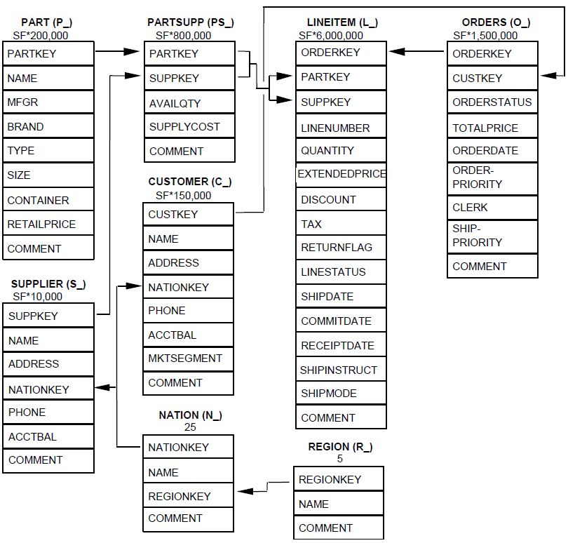 TPC- H 测试模型为数据库服务器连续7×24 小时工作,可能只有1次/月的维护;多用户并发执行复杂的动态查询,同时有并发执行表修改操作。TPC-H基准的数据库模式遵循第三范式。其数据库模型如下图,共有8张表,除Nation和Region表外,其它表与测试的数据量有关,即比例因子SF(Scale Factor)。由于数据量的大小对查询速度有直接的影响,TPC- H标准对数据库系统中的数据量有严格、明确的规定。用SF描述数据量,1SF对应1GB单位,SF由低到高依次是1、10、30、100、300、1000、3000、10000。需要强调,SF规定的数据量只是8个基本表的数据量,不包括索引和临时表。