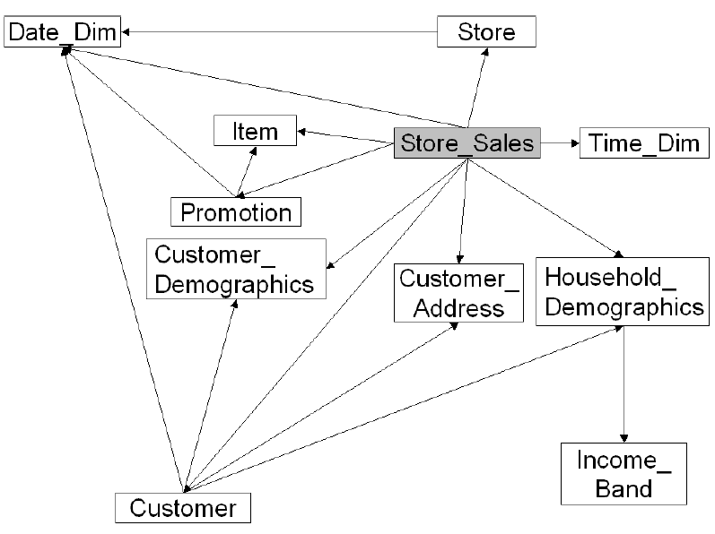 受限于TPC-H,无法反应出数据流转的全流程,且新兴的数据仓库开始采用新的模型,如星型模型、雪花模型。TPC-H已经不能精准反映当今数据库系统的真实性能。为此,TPC组织推出了新一代的面向决策应用的TPC-DS基准。TPC-DS基准意图提供一个公平和诚实的业务和数据模型,以衡量DBMS系统的整体性能,如CPU与内存使用,I/O负载特征以及操作系统和DBMS完成海量数据复杂计算等。这个基准测试有以下几个主要特点: