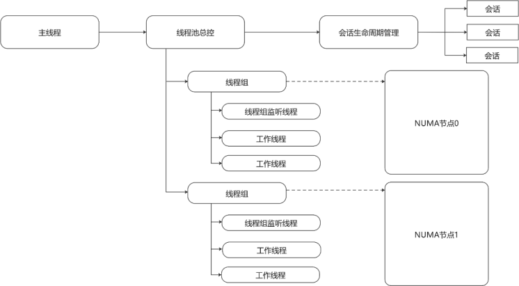 Postmaster线程在ServerLoop中判断如果启用了线程池功能,则会调用“ThreadPoolControler::Init”函数进行线程池的初始化。在线程池初始化时,会判断NUMA节点的个数进行NUMA结构处理。相关代码如下: