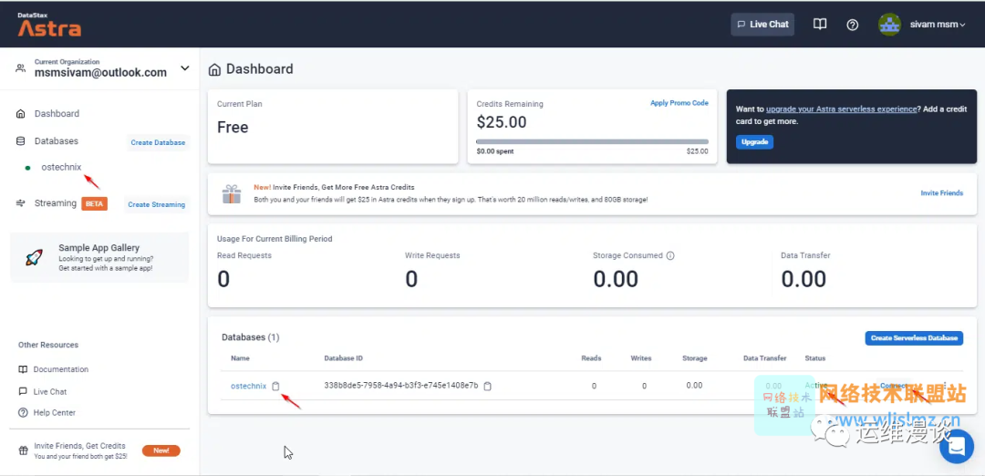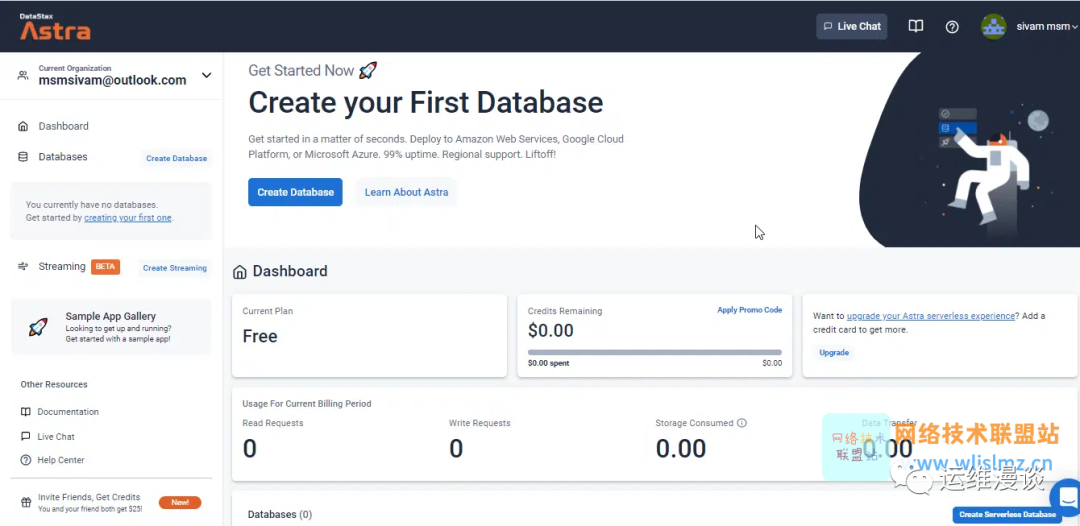 单击Astra DB 仪表板左侧窗格中的“创建数据库”按钮,出于本指南的目的,我们将在具有 25 美元信用的免费计划下创建数据库,我们可以随时采用现收现付计划。