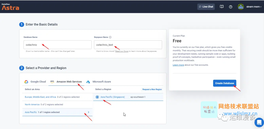 输入数据库名称。请注意,DB的名称以后无法更改。 输入键空间名称以反映您的数据模型。它就像 SQL 数据库中的一张表。 选择要启动数据库的云提供商名称和区域。
