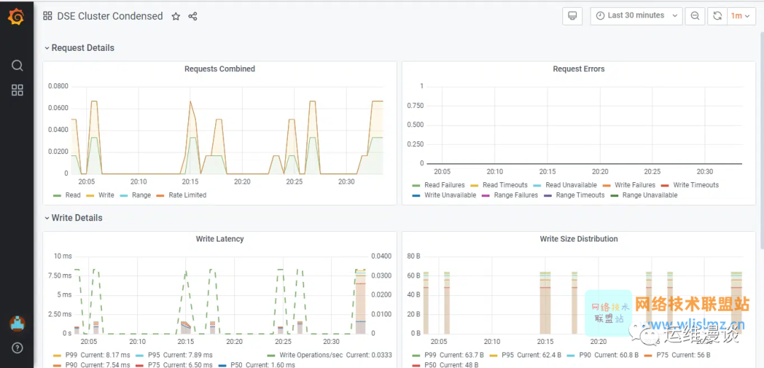 集成在 Astra DB 控制台中的 Grafana 仪表板显示了数据库指标,图表中给出了指标详细信息,并且会随着时间的推移而捕获。以纳秒为单位显示读取和写入延迟。