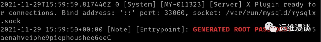 如果您MYSQL_RANDOM_ROOT_PASSWORD=1在启动容器时使用过,那么您可以从日志中获取自动生成的密码。