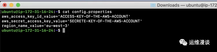 创建“ config.properties”文件,其中将包含您的 AWS 用户 aws_access_key_id_value 、aws_secret_access_key_value 和区域。在此文件中添加您的密钥。