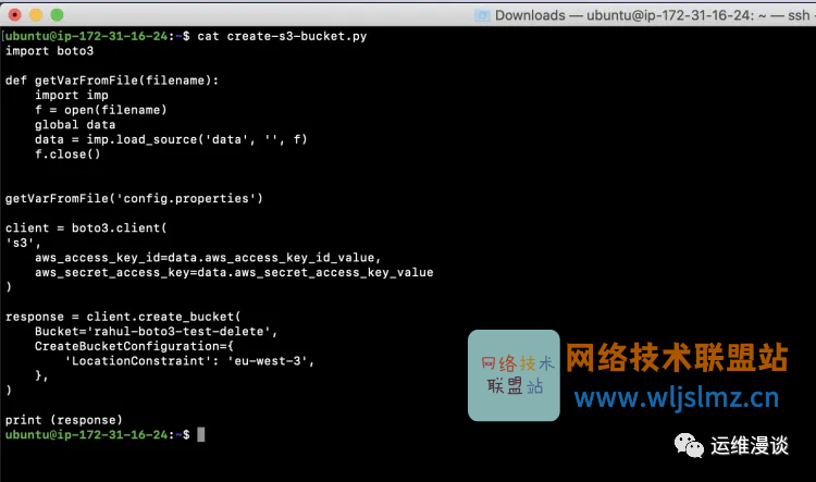 现在,创建一个文件“ create-s3-bucket.py ”并在其中添加以下代码,此代码将读取在上一步中定义的值并使用您在此文件中定义的名称创建一个存储桶,在这里,我将创建一个名为“rahul-boto3-test-delete”的存储桶,将其更改为您想要的。