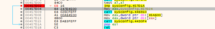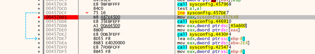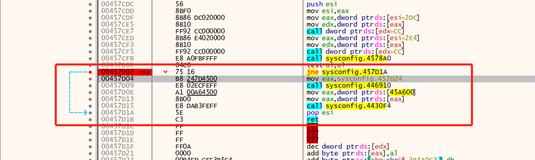 2)通过搜索,得到00457D04和00457DD1两个地址,查看这两个地址的汇编代码。