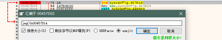 3)通过上图中的汇编代码可以确定:程序通过上一行的[jne]进行密码校验,如输入错误的密码则弹窗并退出程序,输入的密码正确则跳过弹窗的部分。因此本实验采用将jne逻辑判断跳转修改为强制跳转的方式进行绕过,将jne改为jmp以实现强制跳转(jne和jmp均为汇编语言中的跳转指令,jne的效果为,当zf标志位=0时,跳转至标号处执行,可以简单理解为高级语言中的if语句,jmp为无条件跳转可以简单理解为高级语言中的goto语句)。