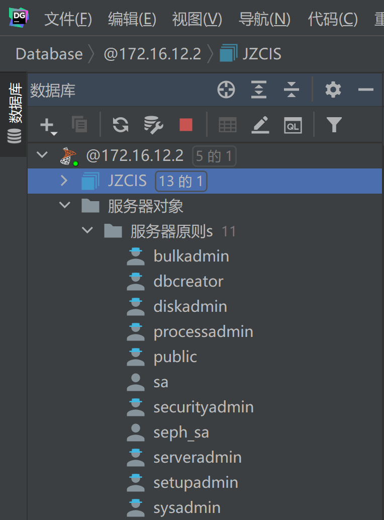 1、使用DataGrip连接数据库,成功连接数据库,可以查看到连接的数据库JZCIS。