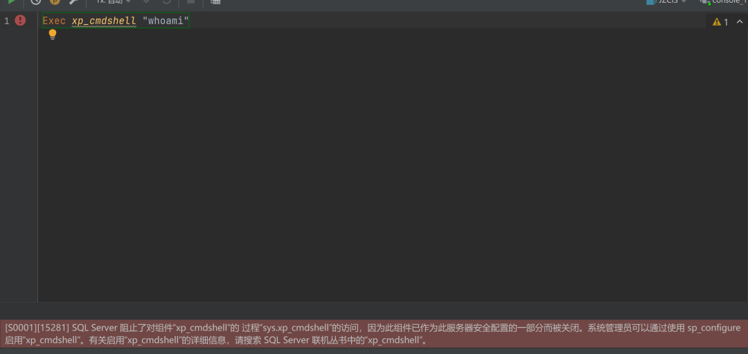 2、新建查询,尝试使用xp_cmdshell执行命令,显示xp_cmdshell已经被安全策略关闭,无法执行命令。
