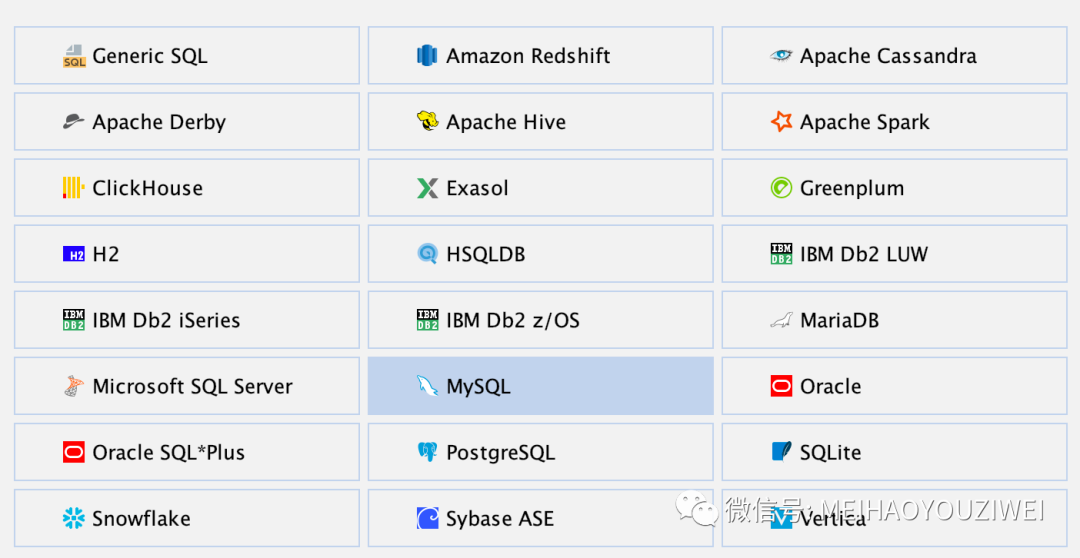 DataGrip是多引擎数据库环境,支持几乎常见的数据库类型:PostgreSQL、MySQL、Oracle Database、SQL Server、Azure、Amazon Redshift、SQLite、DB2、H2、Sybase、Exasol、Apache Derby、MariaDB、HyperSQL、Snowflake、Cassandra、ClickHouse、Greenplum、Apache Hive、Vertica、MongoDB等,满足了不用切换多种数据库工具的麻烦。如下图。