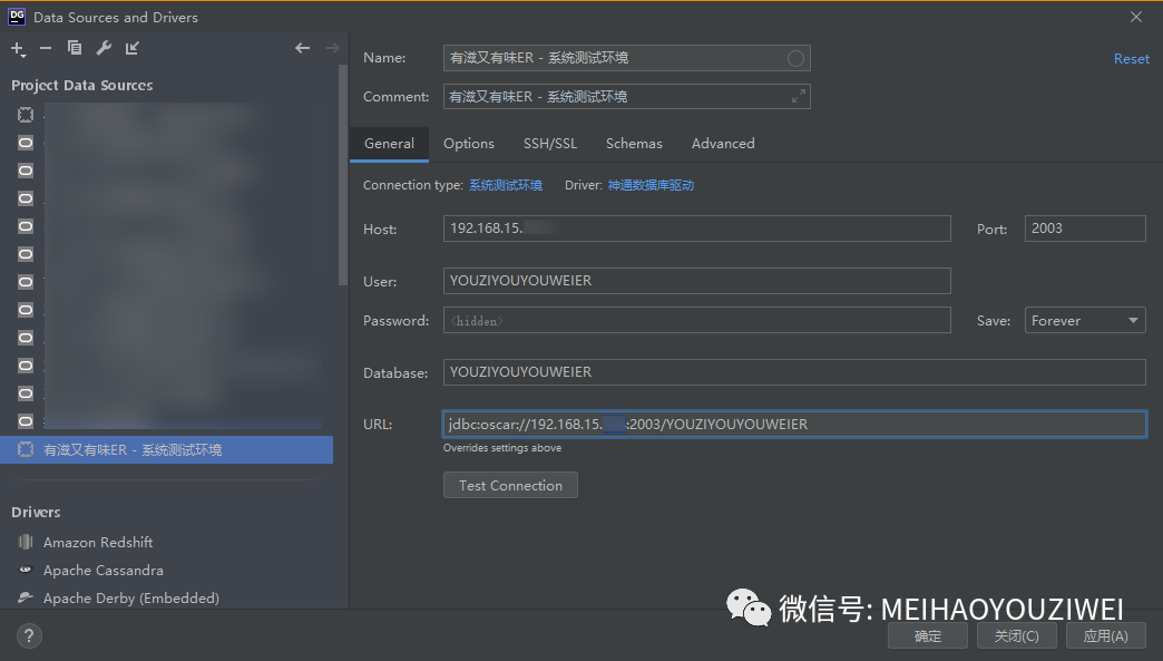 配置完毕驱动后,依次单击File-New-Data Source-神通数据库驱动,在打开的Data Sources and Drivers 窗口配置Name、Comment、Host、Port、User、Password、Database、URL,然后单击【TestConnection】按钮测试连接,测试通过后,单击【确定】按钮,添加完毕,就可以正常使用了。