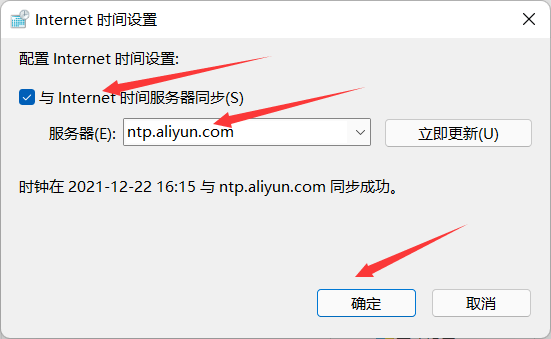 在Internet 时间设置对话框里,选择与Internet时间服务器同步,填写一个阿里云内网NTP服务器地址ntp.aliyun.com,并单击立即更新,确定。