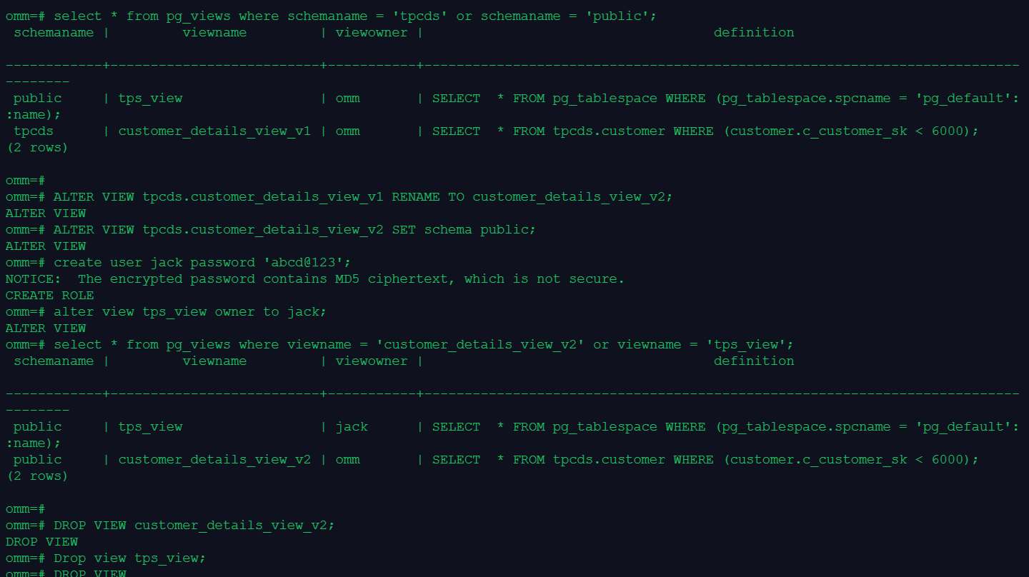 omm=# select * from pg_views where schemaname = 'tpcds';