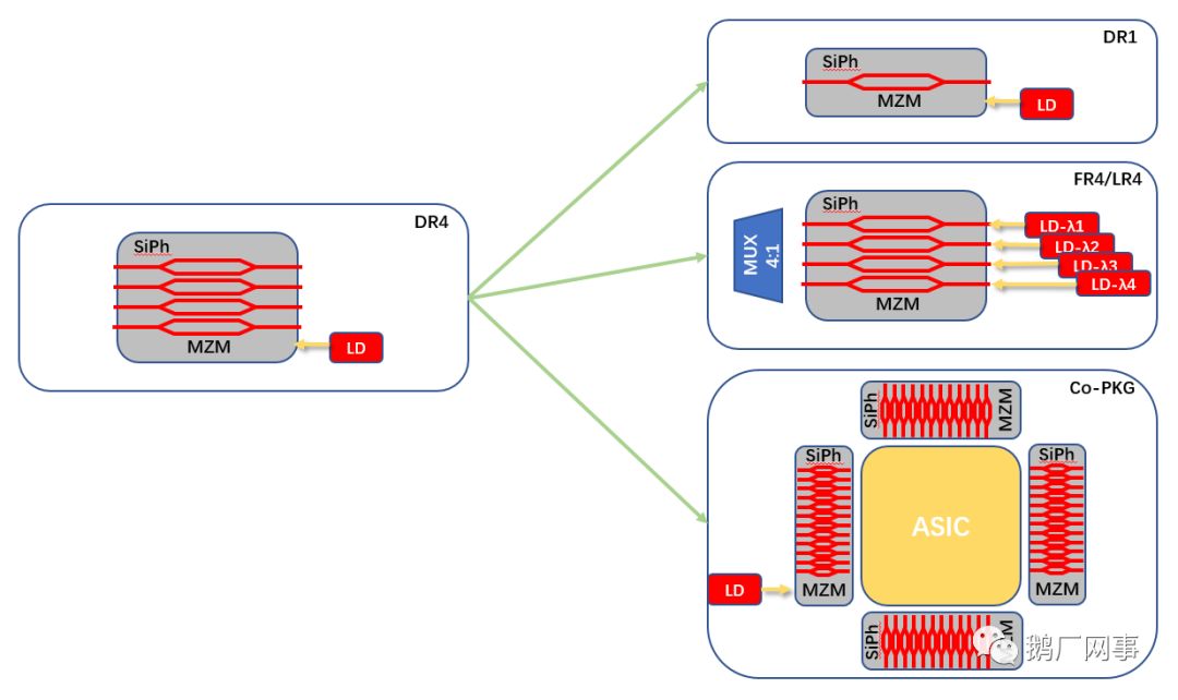 从方案上讲,400G DR4是400G硅光光模块的基础形态,在数据中心400G时代,既可以实现1分4的Breakout组网,与100G DR1/FR1对传,又可以替代接入侧短距离多模400G光模块互联,具备端到端成本竞争力。在单纤传输的优势下,与多波长光源封装可以轻易切换为WDM模块形态。同时数据中心光交换设备正在向着Co-PKG形态演进,多路并行硅光集成方案将会是标准的形态。
