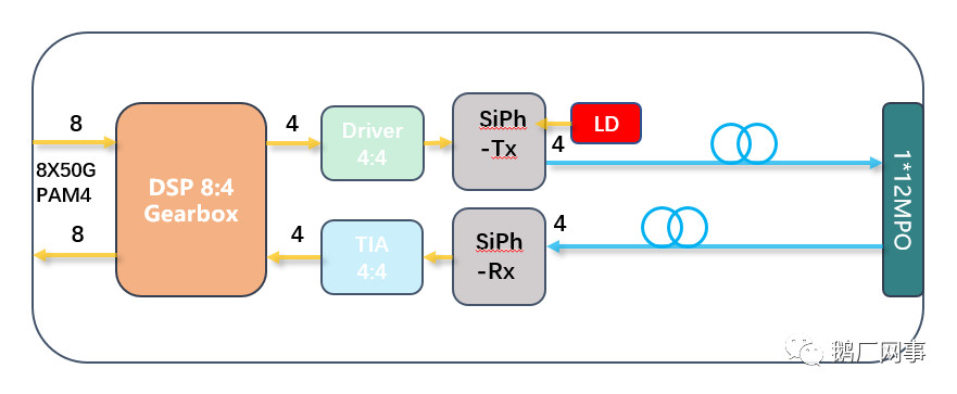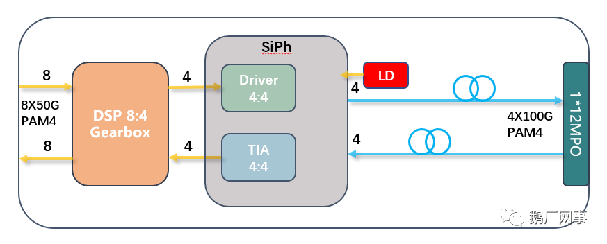 该方案核心芯片为一颗采用了3D封装硅光全集成光引擎,单颗芯片同时集成了MZM,PD,Driver及TIA功能芯片,3D BGA封装的优势在于能够降低高频衰减以及优化MZM调制器的调制均衡,数字信号处理(即DSP芯片)选用一颗目前行业最先进的400G 7nm PAM4 (8:4)芯片,单颗芯片功耗<4W。