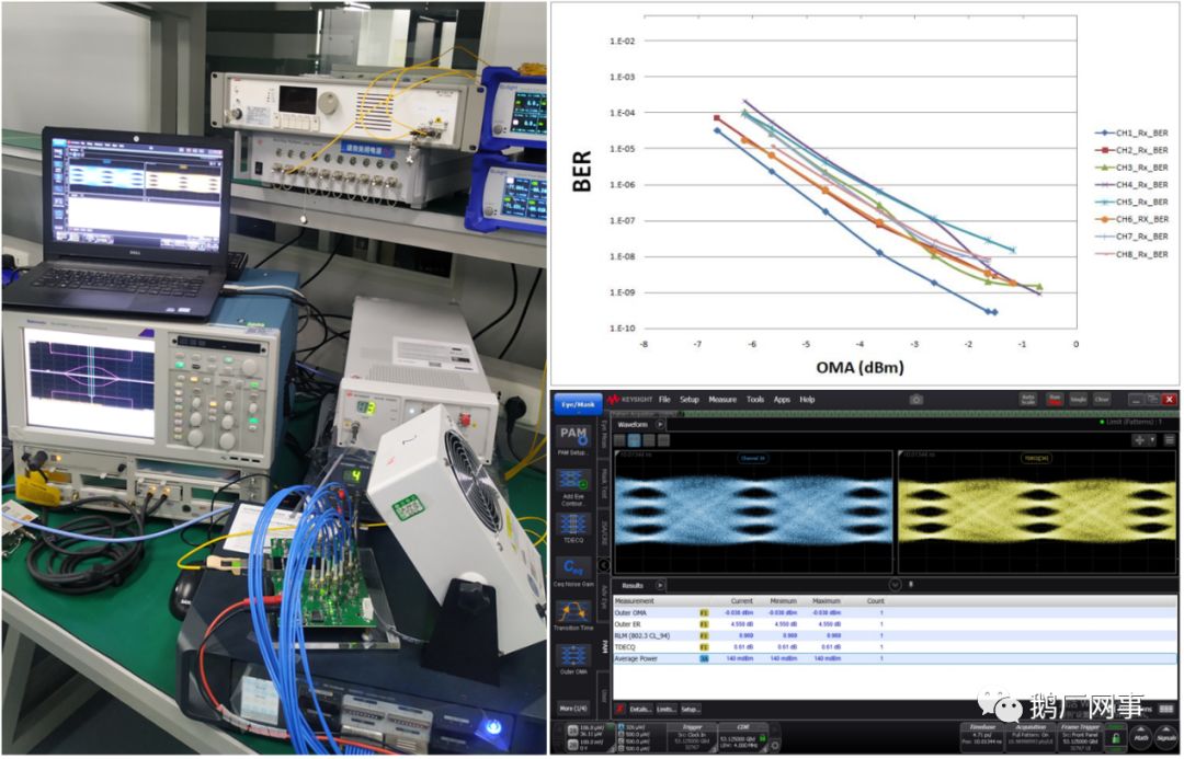 经测试,各项指标已经超出预期,长期测试接收误码率,不开FEC下BER<10-8,BER floor可以做到10-10, 发射端眼图TDECQ指标一般调节水平<0.6dB,均衡BER后可以做到<0.5dB,表现优异,模块整体功耗实测小于8.9w,甚至优于大部分400G多模光模块水平,这也是得益于集成化PIC和7nmDSP的功耗优化。