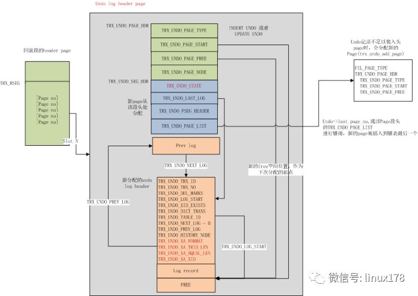 每一个Undo log segment实际上对应一个独立的段,段头的起始位置在UNDO 头page的TRX_UNDO_SEG_HDR+TRX_UNDO_FSEG_HEADER偏移位置(见下图)