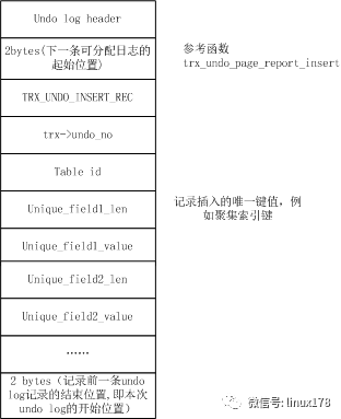 对于INSERT_UNDO,调用函数trx_undo_page_report_insert进行插入,记录格式大致如下图所示:
