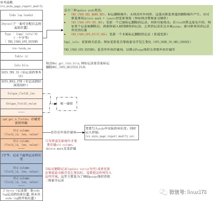 对于UPDATE_UNDO,调用函数trx_undo_page_report_modify进行插入,UPDATE UNDO的记录格式大概如下图所示: