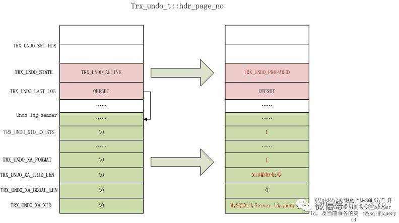 分别设置insert undo 和 update undo的状态为prepare,调用函数trx_undo_set_state_at_prepare,过程也比较简单,找到undo log slot对应的头页面(trx_undo_t::hdr_page_no),将页面段头的TRX_UNDO_STATE设置为TRX_UNDO_PREPARED,同时修改其他对应字段,如下图所示(对于外部显式XA所产生的XID,这里不做讨论):