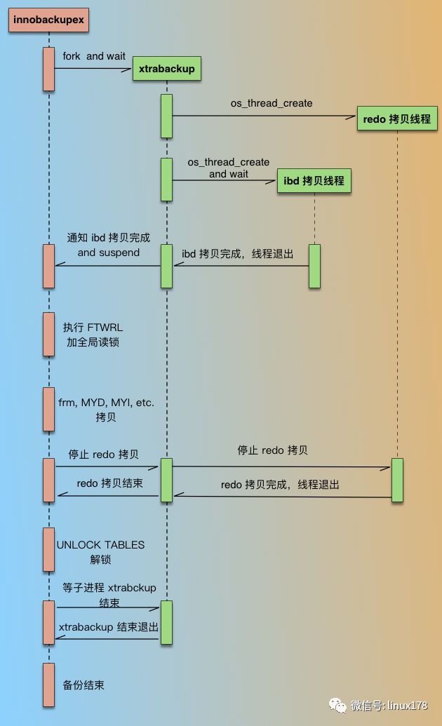 xtrabackup 收到 innobackupex 备份完非 InnoDB 通知后,就停止 redo 拷贝线程,然后通知 innobackupex redo log 拷贝完成(通过创建文件);