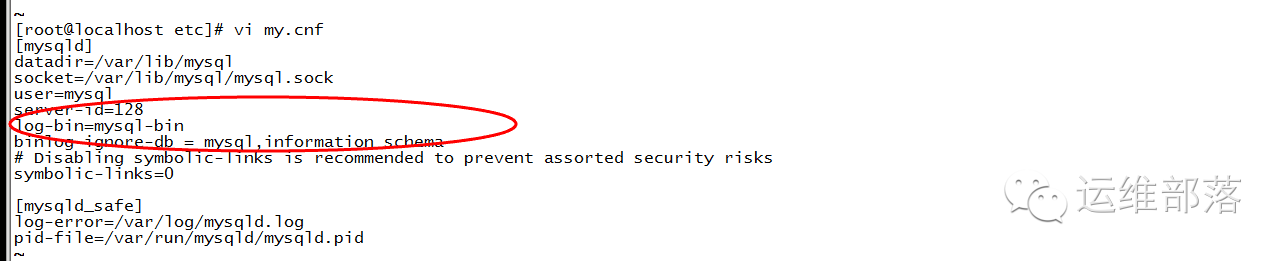 server-id=128 #设置服务器唯一的id,默认是1,我们设置ip最后一段,slave设置131 log-bin=mysql-bin # 启用二进制日志 binlog-ignore-db = mysql,information_schema #忽略写入binlog的库,因为这些都不是我们关心的自己创建的业务库