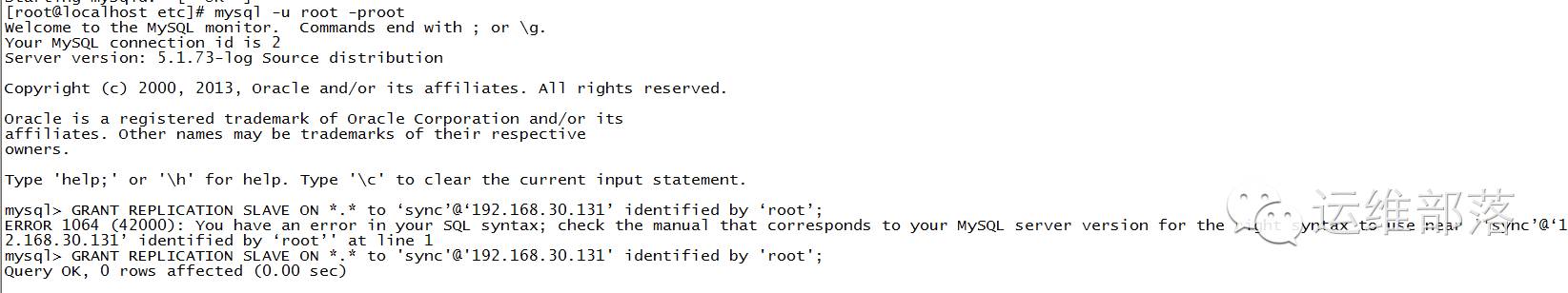 GRANT REPLICATION SLAVE ON . to 'sync'@'192.168.30.131' identified by 'root'; //新建一个sync用户密码为root给slave机器使用。后面salve机器配置会使用到