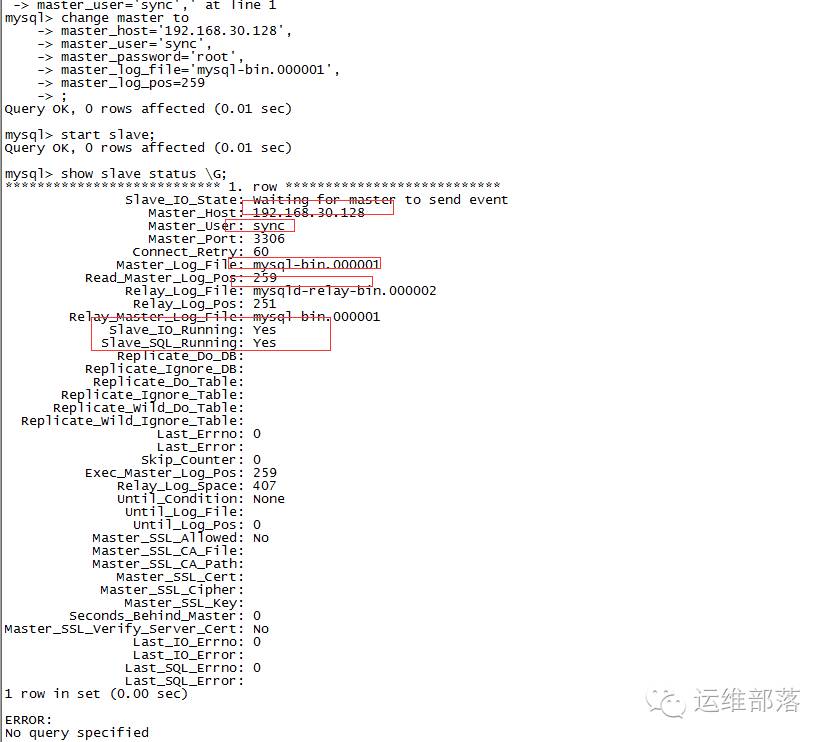 change master to master_host='192.168.30.128', //master的ip master_user='sync', //master授予的用户名称 master_password='root', //密码 master_log_file='mysql-bin.000001', //master的binlog名称 master_log_pos=259;//位置