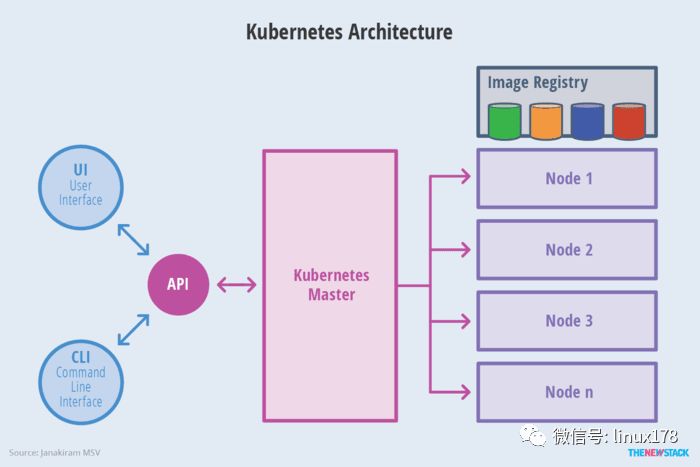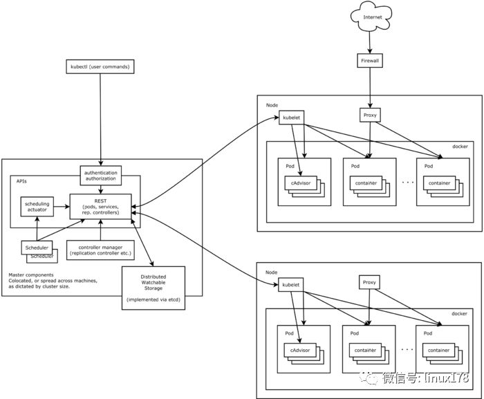 我们先从简单的架构图看,下图所示架构,提供了松耦合的服务发现。像大多数的分布式系统,K8S集群至少需要一个主节点(Master)和多个计算节点(Node)。