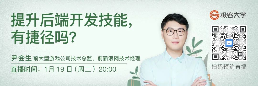 1 月 19 日(周二)20:00 前大型游戏公司技术总监 前新浪网技术经理 尹会生,将在极客时间 Live 带来【提升后端技术开发,有捷径吗?】主题免费直播