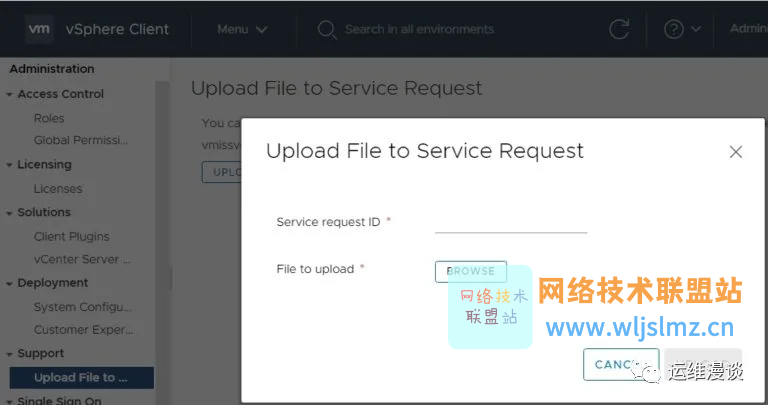 单击 vCenter 菜单中的管理,然后单击支持下的将文件上传到服务请求。