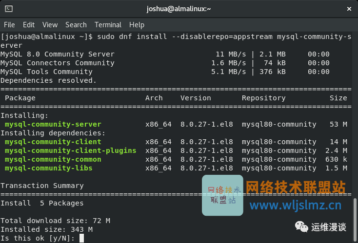 接下来,安装 MySQL 8 社区服务器。以下命令将禁用 App Stream 版本并启用社区版。