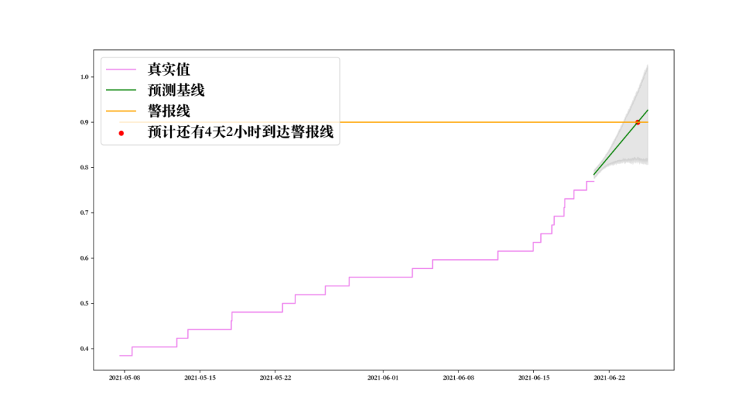 算法可以学习磁盘使用率历史数据的增长情况,对未来一段时间的磁盘使用率进行预测,一旦发现在临近的某个时间点(比如四天后)磁盘使用率将超过警报线时,就能提前一周通过预警告诉运维人员四天后磁盘将满,这将给运维人员足够的时间进行动态扩容,以避免出现资源匮乏而引发损失的问题,最终避免运维故障的发生。