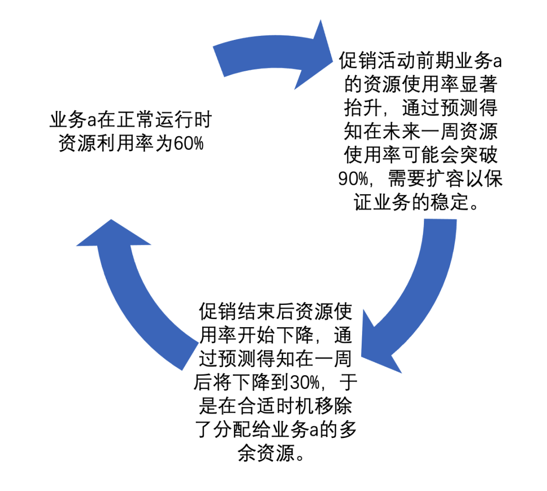 在传统的容量规划中,为了降低容量决策的风险通常会提供一定的冗余容量,而这会降低资源使用效率,增加企业的经营成本。另一方面,人工手动方式进行容量规划效率低,且强烈依赖于人工的经验,难以做到定量标准化。通过对业务机器资源使用情况的分析,结合预测算法对资源利用率的预测结果,能够在保证不影响业务稳定运行的情况下,弹性对分配的机器资源进行扩/缩容,以最大化机器资源使用率,降低运营成本。