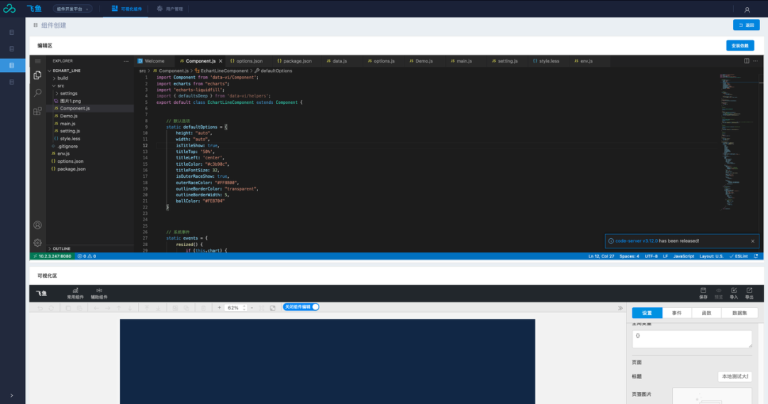 飞鱼支持静态mock数据、http接口、外部数据库等多种方式的数据接入。平台内支持开发与发布自定义前端组件与交互逻辑,支持配置全局的自定义函数、全局事件与全局数据集、支持选择大屏比例和自适应,灵活满足不同的需求场景。让用户告别从0到1手“撸”代码,通过一键生成代码包的方式实现高效率交付。