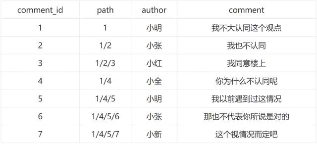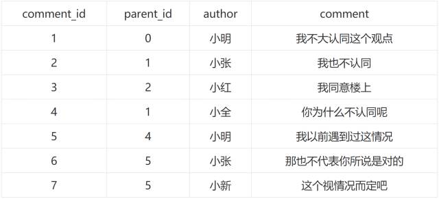 name:地域的名称, parent_id 是父ID,省的父ID是国,市的父ID 为省,以此类推。type 是区域的阶级:1:国,2:省,3:市,4:区在层级比较确定的情况下,这么设计表格没有什么问题,调用起来也很方便。但是使用这种邻接表设计方式,并不能满足所有的需求,当我们不确定层级的情况下,假设我有下面一个评论结构: